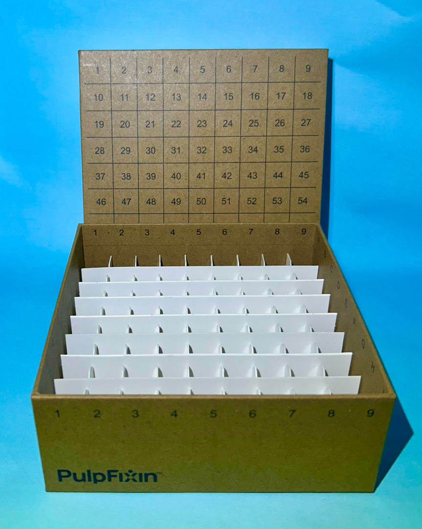 PFR4905P - PulpFixin 49 Place Cryogenic Box, FeatureFilm sealant, Recyclable & Compostable, 3"H x 5,25"L/W for 5ml MCT, Lift Top Lid, Printed with Alpha-Numeric Well ID. A Box of 10pcs